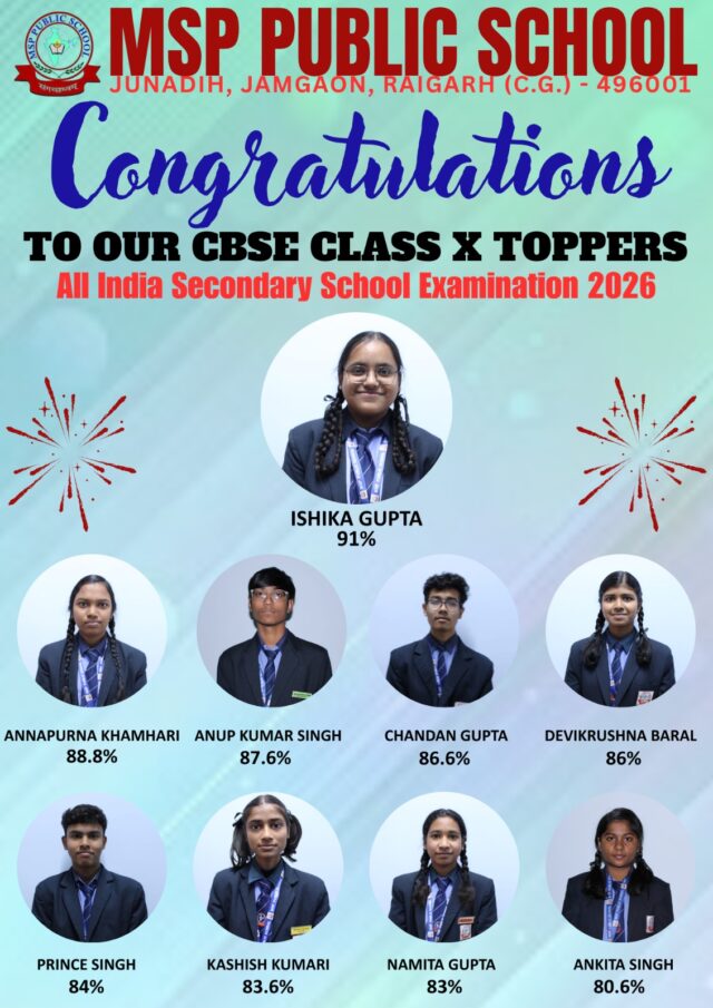 17 अप्रैल, 2026 दिन गुरुवार को केंद्रीय माध्यमिक शिक्षा बोर्ड (CBSE) द्वारा घोषित कक्षा 10 बोर्ड परीक्षा परिणाम में एम एस पी पब्लिक स्कूल के विद्यार्थियों ने अच्छा प्रदर्शन करते हुए विद्यालय का नाम गौरवान्वित किया है।