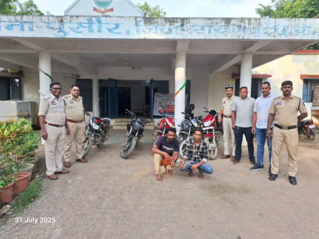 रायगढ़, – पुलिस अधीक्षक श्री दिव्यांग पटेल के दिशा निर्देशन एवं एडिशनल एसपी आकाश मरकाम, सीएसपी अनिल विश्वकर्मा के मार्गदर्शन पर पुसौर पुलिस ने एक बड़ी कार्रवाई करते हुए साप्ताहिक बाजार से मोटरसाइकिल चोरी करने वाले दो शातिर आरोपियों को गिरफ्तार कर उनके कब्जे से पांच चोरी की बाइक बरामद की हैं। बरामद बाइकों की अनुमानित कीमत करीब ₹2.40 लाख है। आरोपियों ने पुसौर सहित आस-पास के बाजारों से बाइक चोरी की बात स्वीकार की है।