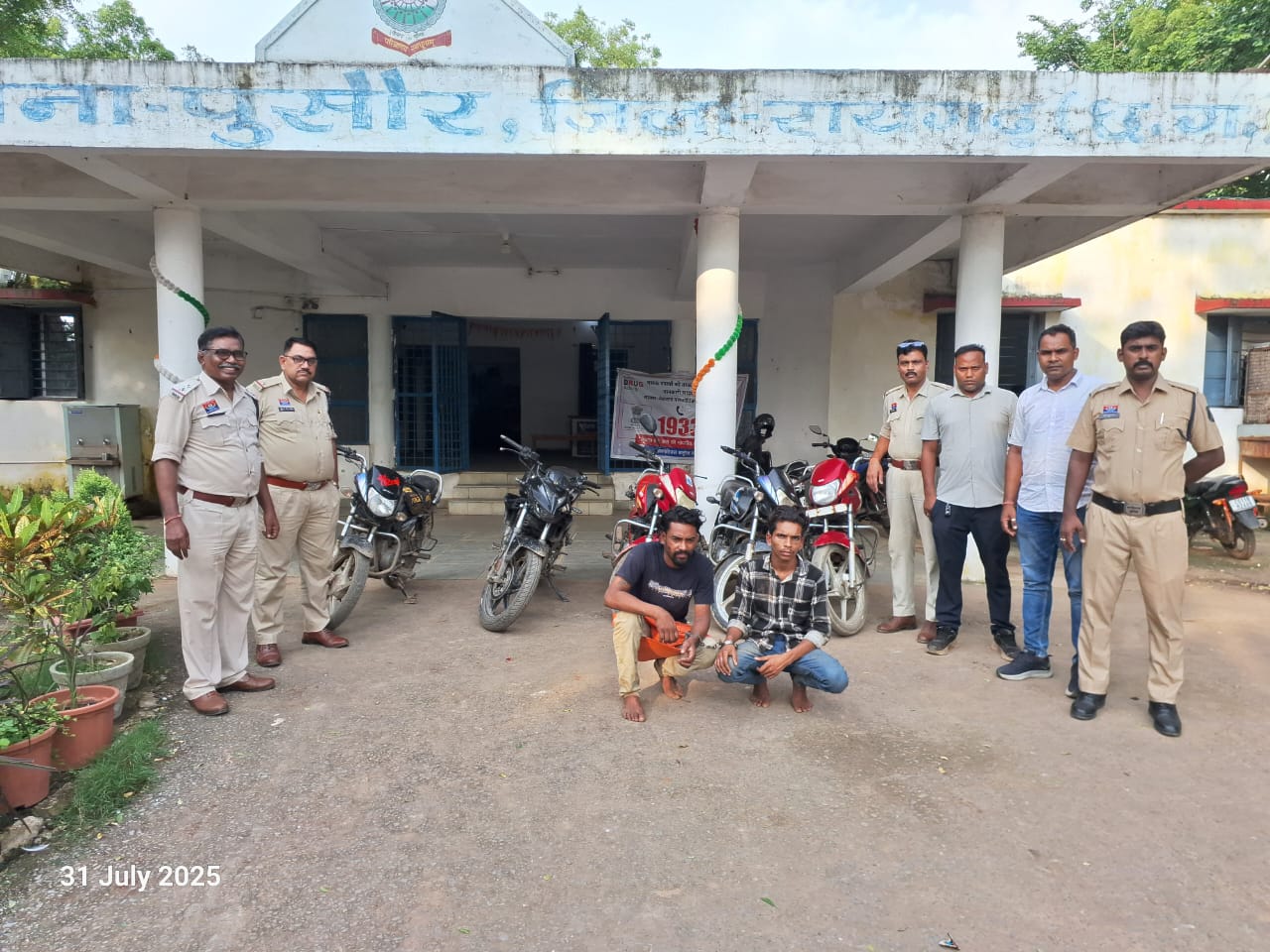 गिरफ्तार आरोपियों की पहचान कमल चौहान और विशाल पाव के रूप में हुई है। दोनों ने मेमोरेंडम कथन में यह भी कबूला कि उन्होंने चिखली, पुसौर, छपोरा और कोडातराई के साप्ताहिक बाजारों से कुल पांच बाइक चोरी की हैं। आरोपी विशाल पाव के कब्जे से 3 नग HF डिलक्स मोटरसाइकिल और कमल चौहान के कब्जे से 1 नग हीरो स्ट्रीम एवं 1 नग HF डिलक्स बरामद की गई।