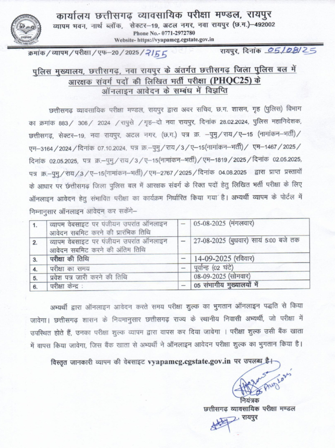 Release regarding online application for written recruitment examination (PHQC25) for constable cadre posts in Chhattisgarh District Police Force under Police Headquarters, Chhattisgarh, Nava Raipur