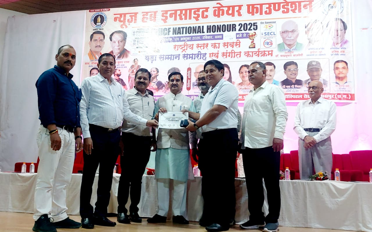 सामाजिक एकता, सेवा और संस्कारों की भावना को जीवंत रखने वाले पूर्वांचल भोजपुरी समाज रायगढ़ को राष्ट्रीय स्तर पर विशिष्ट सम्मान प्राप्त हुआ है। NHICF NATIONAL HONOUR CEREMONY – 2025 के अंतर्गत बिलासपुर स्थित लखीराम ऑडिटोरियम में 05 अक्टूबर 2025 दिन रविवार को आयोजित भव्य सम्मान समारोह में समाज को केंद्रीय आवास एवं पर्यावरण राज्यमंत्री तोखन साहू ने सम्मानित किया।