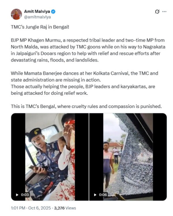 भाजपा आईटी सेल के प्रमुख अमित मालवीय ने ‘एक्स’ (पहले ट्विटर) पर पोस्ट शेयर करते हुए इसे “बंगाल में टीएमसी का जंगल राज!” बताया। उन्होंने आरोप लगाया कि टीएमसी के गुंडों ने आदिवासी नेता और दो बार के सांसद खगेन मुर्मू पर हमला किया। मालवीय ने कहा कि जो लोग सच में जनता की मदद कर रहे हैं, उन पर हमले किए जा रहे हैं, जो “टीएमसी का बंगाल” है।