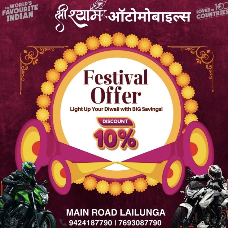 लैलूंगा (रायगढ़): त्योहारों की रौनक अब और भी बढ़ गई है! श्री श्याम ऑटोमोबाइल्स, लैलूंगा ने ग्राहकों के लिए लेकर आया है शानदार “बजाज ग्रैंड फेस्टिवल ऑफर”, जिसमें नई बजाज बाइक खरीदने पर मिल रहे हैं ढेर सारे धमाकेदार फायदे।