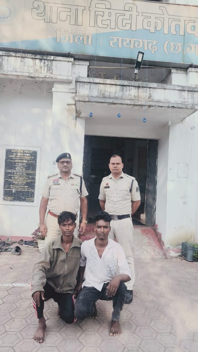 रायगढ़, पुलिस अधीक्षक श्री दिव्यांग कुमार पटेल के दिशा-निर्देशन एवं नगर पुलिस अधीक्षक श्री मयंक मिश्रा के मार्गदर्शन में कोतवाली पुलिस ने तत्परता दिखाते हुए शराब पीने के लिए पैसे की मांग कर मारपीट करने वाले दो आरोपियों को कुछ ही घंटों में गिरफ्तार कर गैर जमानतीय धाराओं एवं आर्म्स एक्ट के तहत रिमांड पर भेज दिया है।