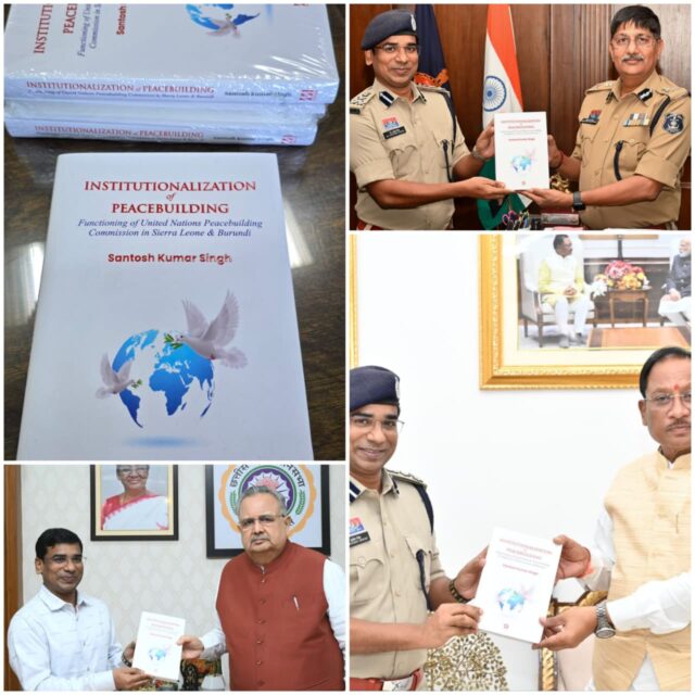 पुलिस मुख्यालय में डीआईजी सीसीटीएनएस/एससीआरबी के रूप में पदस्थ आईपीएस डॉ. संतोष सिंह के संयुक्त राष्ट्र के शांति सुदृढ़ीकरण से जुड़े शोध विषय पर लिखित किताब का प्रकाशन दिल्ली के प्रतिष्ठित मानक पब्लिकेशन द्वारा किया गया है। डॉ सिंह ने माननीय मुख्यमंत्री छत्तीसगढ़ श्री विष्णु देव साय, माननीय विधानसभा अध्यक्ष डॉ श्री रमन सिंह और डीजीपी श्री अरुण देव गौतम को किताब की प्रति भेंट किया।