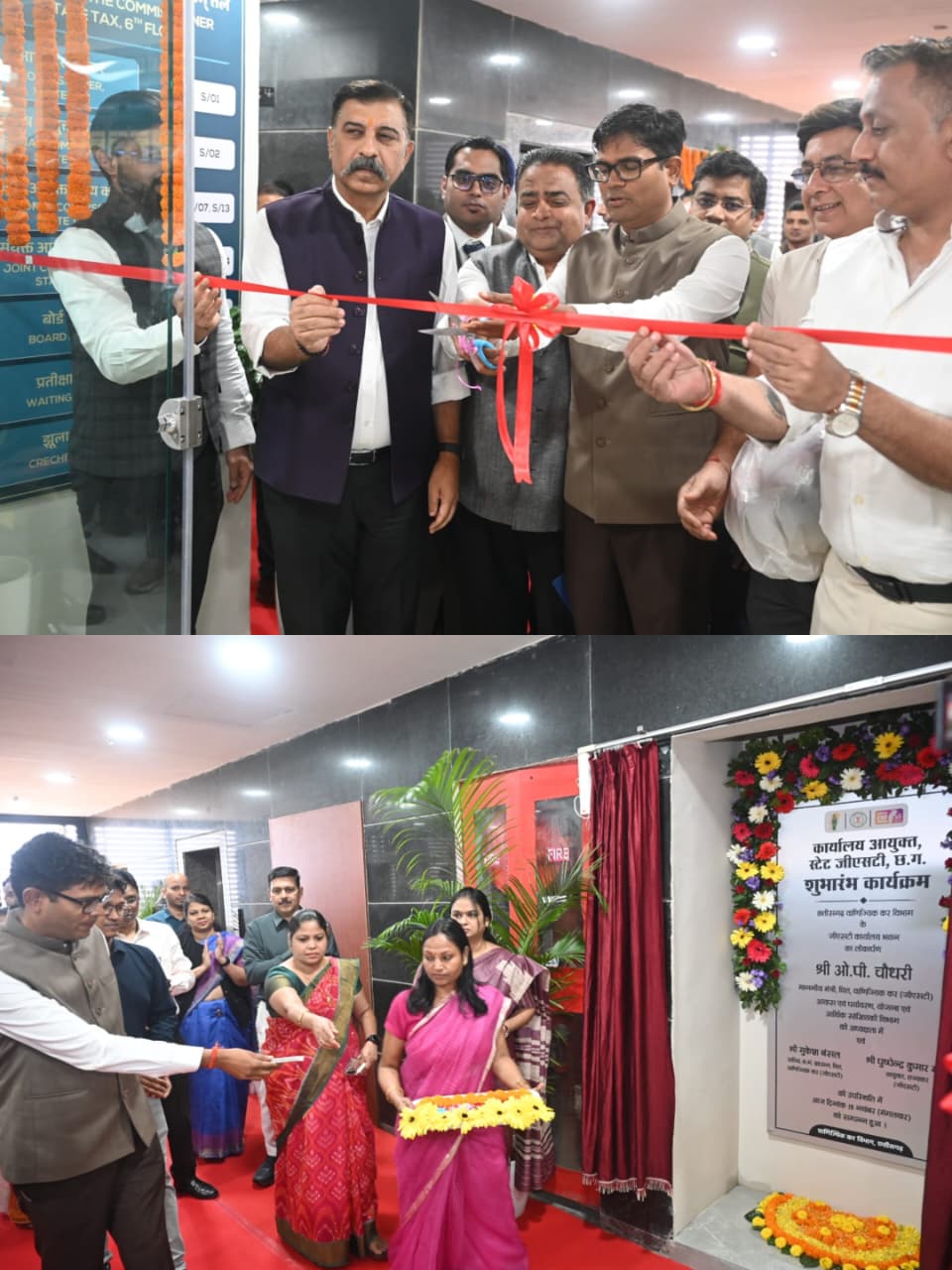 रायपुर, छत्तीसगढ़ के वित्त मंत्री श्री ओ. पी. चौधरी ने आज नवा रायपुर स्थित सीबीडी बिल्डिंग के 5वें एवं 6वें तल पर निर्मित आयुक्त, राज्य कर (GST) के नए अत्याधुनिक कार्यालय भवन का विधिवत शुभारंभ किया। इस अवसर पर वित्त सचिव श्री मुकेश बंसल, चेम्बर ऑफ कॉमर्स के चेयरमैन श्री सतीश थौरानी एवं प्रतिनिधिगण, CAIT के राष्ट्रीय उपाध्यक्ष श्री अमर परवानी, CA एसोसिएशन व बार एसोसिएशन के पदाधिकारी सहित रायपुर मुख्यालय एवं विभिन्न संभागों के अधिकारी-कर्मचारी उपस्थित रहे।