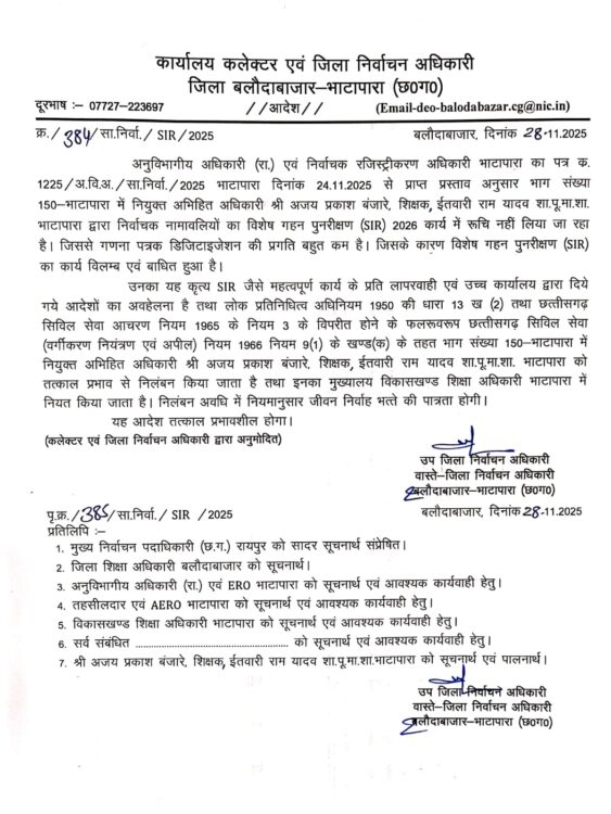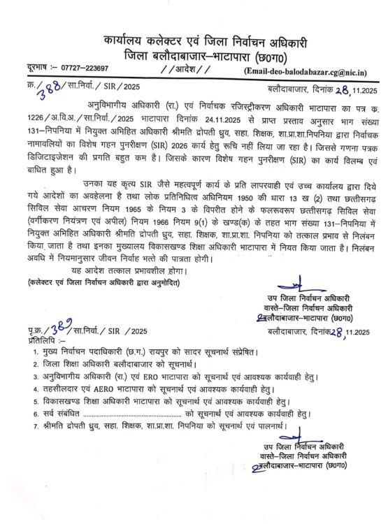 सौरभ बरवाड़/बलौदाबाजार- 28 नवम्बर 2025/कलेक्टर एवं जिला निर्वाचन अधिकारी दीपक सोनी के निर्देश पर एसआईआर कार्य में रूचि नहीं लेने,डिजिटाईजेशन की प्रगति में कमी एवं गणना पत्रक को बीएलओ एप्प के माध्यम से आंनलाइन एन्ट्री का कार्य नहीं करने पर तीन शिक्षकों क़ो निलंबित कर दिया गया है।