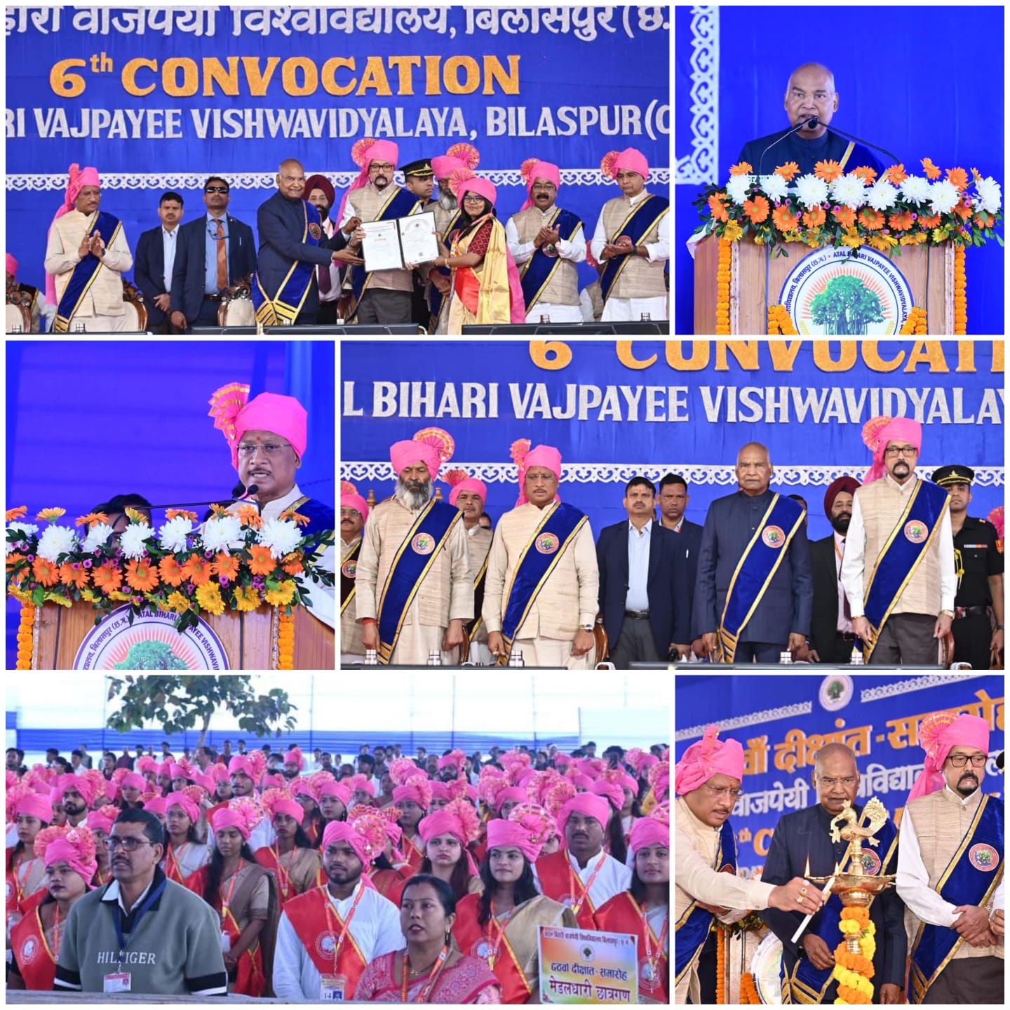 रायपुर, अटल बिहारी वाजपेयी विश्वविद्यालय के छठवें दीक्षांत समारोह का आयोजन आज पूर्व राष्ट्रपति श्री रामनाथ कोविंद के मुख्य आतिथ्य में गरिमामय वातावरण में किया गया। कार्यक्रम की अध्यक्षता राज्यपाल श्री रमेन डेका ने की। अति विशिष्ट अतिथि के तौर पर मुख्यमंत्री श्री विष्णु देव साय, विशिष्ट अतिथि उपमुख्यमंत्री श्री अरुण साव तथा उच्च शिक्षा मंत्री श्री टंकराम वर्मा शामिल हुए। कार्यक्रम में विश्वविद्यालय के कुलपति आचार्य डॉ. दिवाकर नाथ वाजपेयी उपस्थित रहे। समारोह में 64 शोद्यार्थियों को शोध उपाधि, 92 गोल्ड मेडल एवं 36950 स्नातक एवं स्नातकोत्तर उपाधि दी गई।