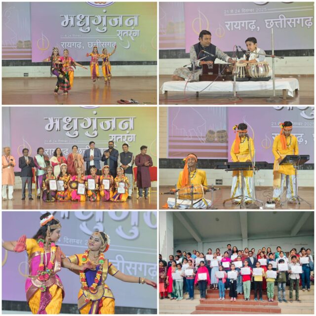 कला एवं संस्कृति की नगरी रायगढ़ में विगत वर्ष की भांति इस वर्ष भी मधु गुंजन संगीत समिति एवं श्री वैष्णव संगीत महाविद्यालय के द्वारा चार दिवसीय मधु गुंजन सतरंग 2025 का शानदार आयोजन किया जा रहा है जिसमें देश के विभिन्न राज्यों के बाल,युवा कलाकार एवं संगीतज्ञ शिरकत कर रहें हैं,अखिल भारतीय नृत्य संगीत कला प्रतियोगिता एवं उत्सव के रूप में अपने पंचम वर्ष में यह उत्सव रायगढ़ में अपनी पहचान बना चुका है राष्ट्रीय स्तर के उक्त कार्यक्रम का उद्घाटन 21 दिसंबर सुबह 9:00 संचालक श्री वैष्णव संगीत महाविद्यालय शरद वैष्णव, वरिष्ठ कला विद श्री मनोज श्रीवास्तव, नृत्य गुरु डॉ नरेंद्र ध्रुव, कार्यक्रम अध्यक्ष अजीत स्वाइन, नृत्य गुरु मधुस्मिता पॉल , के हाथों हुआ कथक ओडिसी भरतनाट्यम लोक नृत्य फ्यूजन नृत्य, तबला शास्त्रीय गायन, सुगम गायन लोक संगीत के की 90 प्रस्तुतियां हुई जिसमें 210 प्रतिभागीयों ने भाग लिया उसके अतिरिक्त ड्राइंग और पेंटिंग के लगभग 50 बच्चों ने हिस्सा लिया इसके अतिरिक्त उत्सव कलाकार के रूप में, कौस्तुभी महापात्र कथक नृत्य , रिद्धिमा पांडे कथक नृत्य इशिता कश्यप कथक नृत्य पार्थ यादव तबला फानेंद्र दुबे तबला एवं भरतनाट्यम की सामूहिक प्रस्तुति हुई जिसमें कनिहा उन्नी लाईजु,साक्षी चंद्रा, सात्विकी सिंह, भाव्या, अनुष्का एवं धान्वी ने अपनी प्रस्तुति से दर्शकों में अमिट छाप छोड़ी समिति के सदस्यों ने रायगढ़ की कला प्रेमी जनता से विनम्र आग्रह किया गया है कि वह देश के विभिन्न क्षेत्रों से पधारे हमारे सभी नवोदित कलाकारों के उत्साह वर्धन हेतु अधिक से अधिक संख्या में पधार कर उक्त कार्यक्रम को सफल बनाएं, उक्त आयोजन रायगढ़ की नगर पालिका पंजरी प्लांट के ऑडिटोरियम में आयोजित हो रही है , प्रथम संध्या का समापन सिविल सर्जन डॉक्टर दिनेश पटेल, डॉ अभिषेक अग्रवाल मेडिकल सुपरीटेंडेंट, श्रीमती पूनम सोलंकी, सुश्री बसंती वैष्णव अंतरराष्ट्रीय कथक नृत्यांगना, प्रतिनिधि कल गुरु रायगढ़ घराना पंडित सुनील वैष्णव, आयोजक श्री शरद वैष्णव एवं अजीत स्वाइन जी की उपस्थिति में संपन्न हुआ