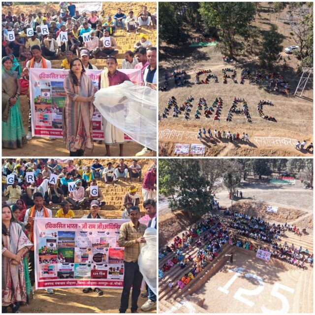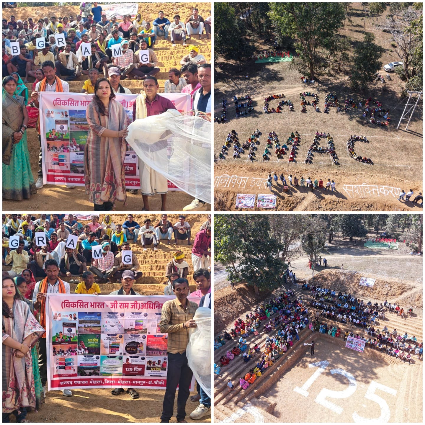 रायपुर , आदिवासी बहुल एवं कृषि आधारित आजीविका वाले जिले मोहला मानपुर अम्बागढ़ चौकी की ग्राम पंचायत करमरी में सोमवार को वीबी जी राम जी (विकसित भारत गारंटी फ़ॉर रोजगार एंड आजीविका मिशन- ग्रामीण) के अंतर्गत जागरूकता कार्यक्रम का आयोजन किया गया। इस कार्यक्रम ग्रामीणों द्वारा मानव श्रृंखला बनाकर ‘आत्मनिर्भर गांव – विकसित भारत’ का संदेश दिया गया। इस दौरान योजना के प्रति उत्साह और सामुदायिक सहभागिता स्पष्ट रूप से देखने को मिली।